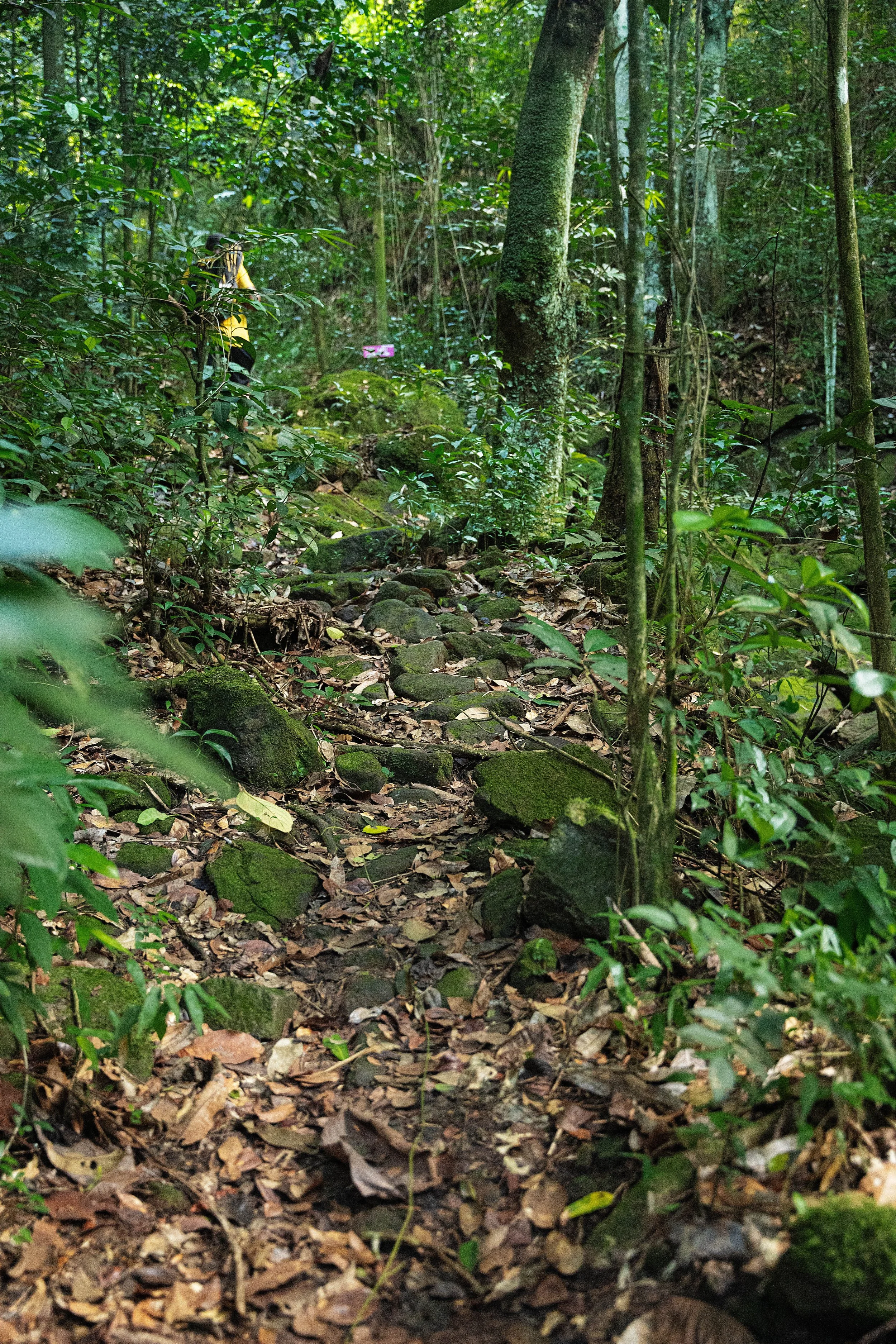 Terrain - dirt path with loose gravel, rainforest, boulders, humid dense foliage